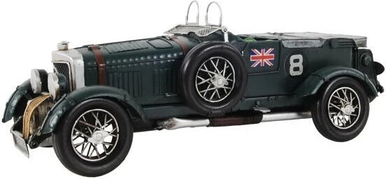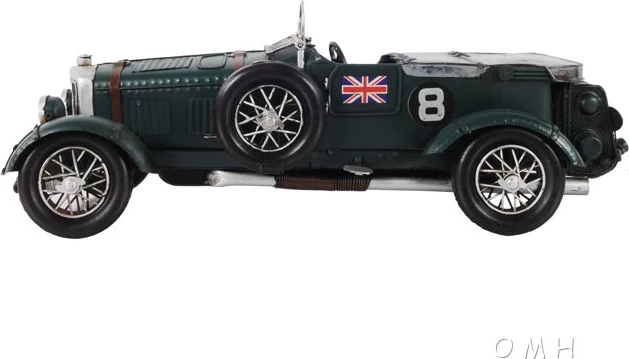 The Bentley 4.5 Litre is a British race car built by Bentley Motors. This car was made to compete in the 24-hours of Le Mans. The 24 Hours of Le Mans is a 24-hour race around the Circuit de la Sarthe. This is the oldest active 24-hour endurance race. The race is held annually in Le Mans, France. During the 24 Hours of Le Mans in 1924, Bentley Motors won with there Bentley 3 Litre. They won again with the same Bentley 3 Litre in 1927. In 1928, Bentley Motors won once more but this time they used the 3 Litre’s successor, the Bentley 4.5 Litre. They won the next two races (1929-1930) using the Bentley Speed Six, the successor from the 4.5 Litre. Our model is the Bentley Blower. The Blower Bentley is the model from the Bentley 4.5 Litre. The Blower Bentley, which is the same car and same inline 4 engine as the Bentley 4.5 Litre except it is supercharged. It has its top off and right-hand drive just like the real car. We have details from the supercharger sitting on the front of the car to the straps that hold the hood down. Our model is a 1:13 scale. It is 13.5 inches in length, 4.5 inches in width, and 5.5 inches in height. This is a great scale for the display shelves.