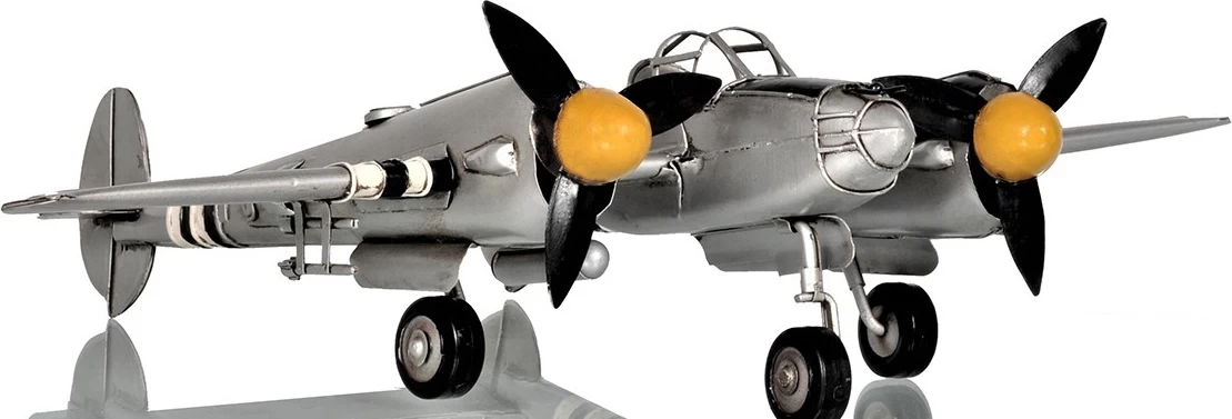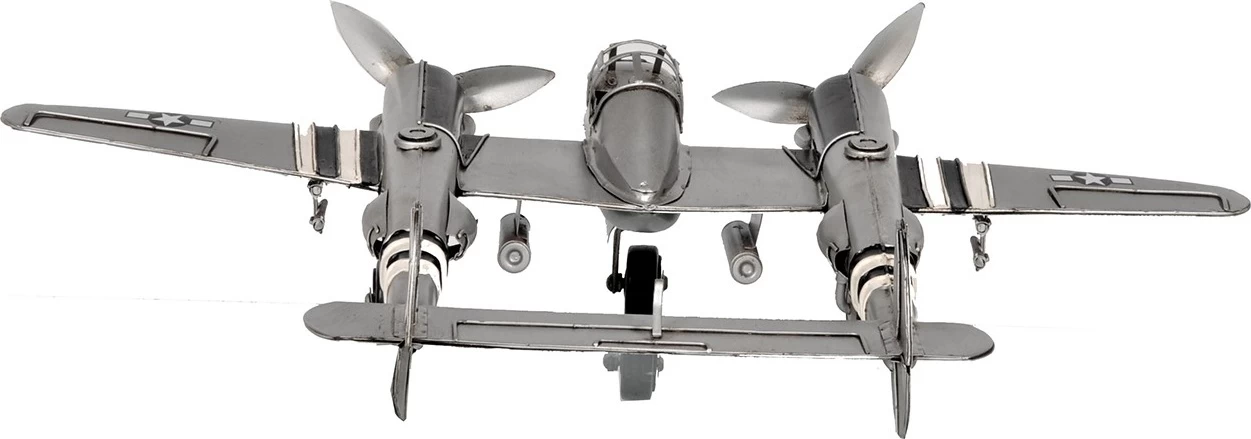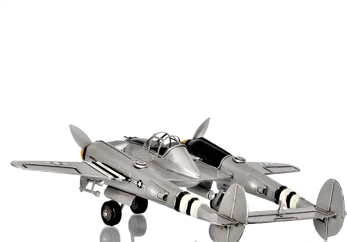 The P-38 lighting is a twin-engine fighter designed by Lockheed for the US army air corp armed with 50 caliber machine guns and a cannon all within the nose of aircraft allowing for ease of aiming and to remove the need for gun convergence. Its large size allowed it to escort bombers deeper into Germany and for it to perform long-range recon missions. This model features nose mounted guns, twin rotating props, and tricycle rotating landing gears. The plane sizes make it perfect for decorating a shelf, placed in a small display case next to a larger centerpiece, or by a bedside for those who enjoy the history held in the lighting through its years of service.