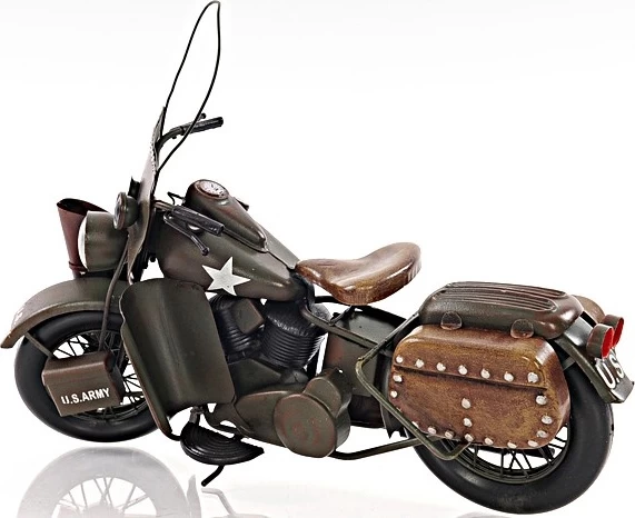 The WLA is a model of Harley-Davidson motorcycle that was produced to US Army specifications in the years during and around World War II. This vintage 1942 WLA model was handcrafted of iron and has a scale of 1:12. It features intricate details such as spoke wheels, seat, light weight frame, pedals, storage compartment, and a wind screen. A must have for the collector and enthusiast!
