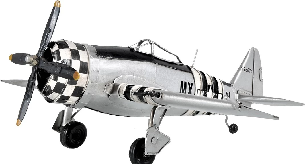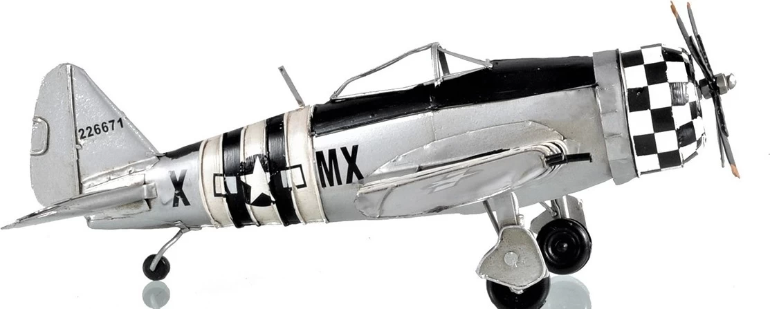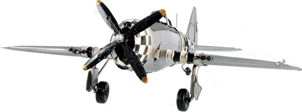 The P-47 thunderbolt was the dominant fighter in the US army’s air corp and wasn’t replaced in that role until the P-51 entered service. It flew alongside the P-38 lighting in providing fighter escort for heavy bombers of Germany. The model features a rotating prop, mock wing guns, and a checkered engine cowling a popular design choice for the aircraft. It’s made of tin, its size makes it perfect for sitting on a bookshelf, and is ideal for countertop decor.