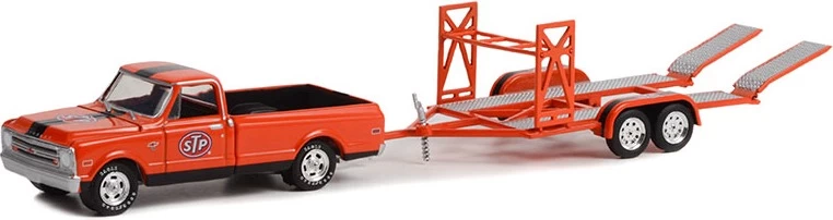 This is the 1968 Chevrolet C-10 STP with Bed Cover and STP Tandem Car Trailer in 1:64 scale by Greenlight.