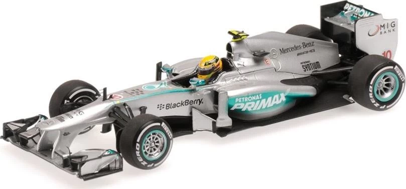 This is the 2013 MERCEDES AMG PETRONAS F1 TEAM W04 – LEWIS HAMILTON – 1ST PODIUM MALAYSIAN GP Diecast Model Car in 1:43 Scale by Minichamps. Nicely detailed, beautifully crafted diecast scale model racing car.