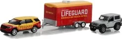 This is the 2016 Ford Explorer Emerald Bay Beach Patrol Lifeguard with 2013 Jeep Wrangler Rubicon in Enclosed Car Hauler Baywatch (2017) in 1:64 scale by Greenlight.