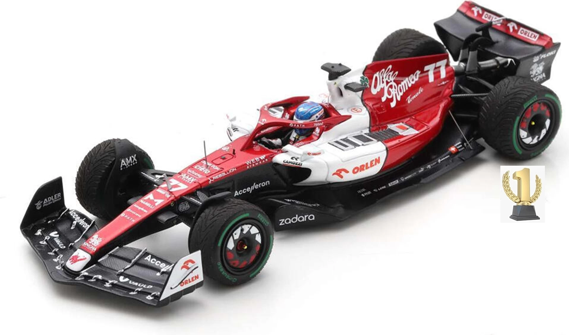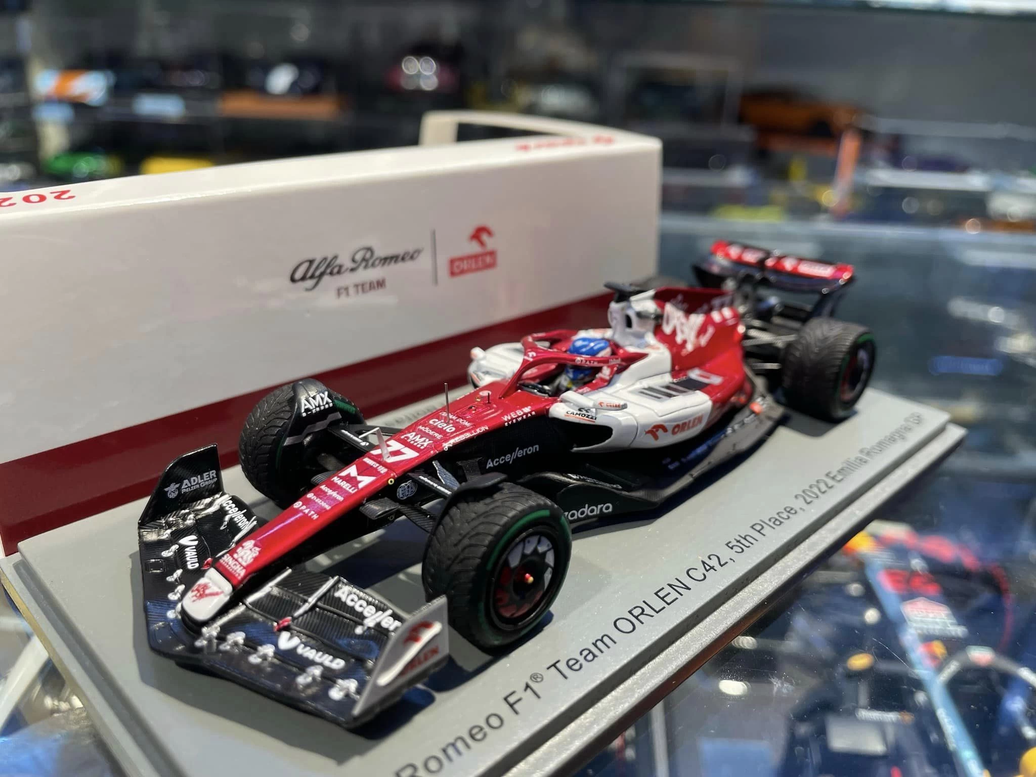 This is the 2022 Alfa Romeo F1 Team ORLEN C42 #77 5th Emilia Romagna GP Valtteri Bottas in 1:43 scale by Spark.