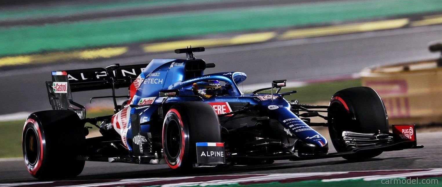 This is the ALPINE F1 TEAM A521 FERNANDO ALONSO QATAR GP 2021 in 1:43 scale by Minichamps.