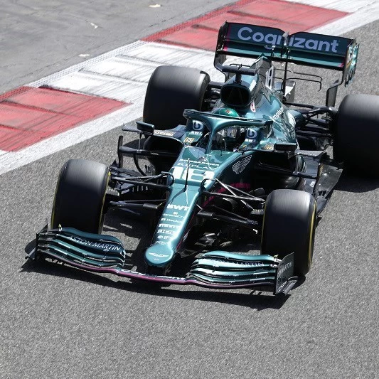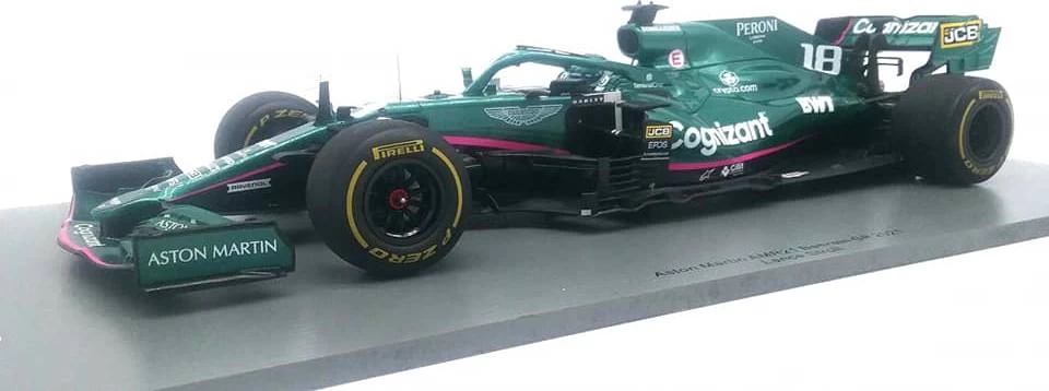 This is the ASTON MARTIN AMR21 NO.18 ASTON MARTIN COGNIZANT F1 TEAM BAHRAIN GP 2021 LANCE STROLL in 1:18 scale by Spark.