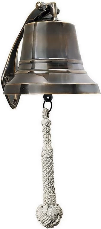 The helmsman rings the ship’s bell for every half hour of the four-hour ship’s watch. A ship is a round-the-clock operation, and ship’s crews work four hours on and four hours off. To change the routine two two-hour dogwatches usually run between 4 and 8 PM. One bell – One ring (say 12:30)… Two bells – Two rings (say 1 PM)… etc. until… Eight bells – Eight rings (4PM). AM-Living bells are made of heavy solid brass, handmade and sand-cast. The chunky hand knotted lanyard offers years of use. We offer four sizes of bells, petite to large, for beach house or boat. A true nautical heirloom offering clear & solid sounds.