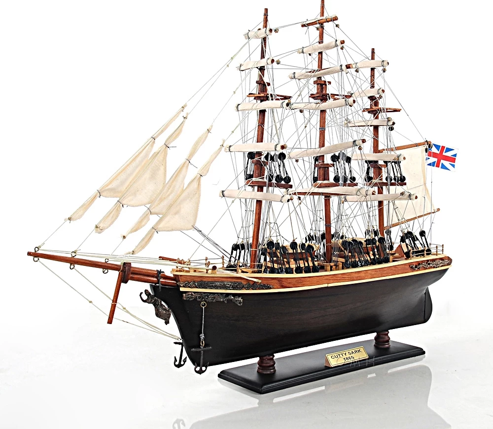 Our Cutty Sark model is scratched built plank on frame and strip by strip of exotic wood put together. It is completely hand built by skillful and creative master craftsmen; you will be amazed at how real it looks. The hull is truly beautiful, combined with skills and pure wood, the hull is smoothening out equally giving a shiny and silky feel on side of the hull. On the ship, you can easily locate stunning wooden details such as: 3 wooden booms, 1 wooden bunker, 4 front and 1 main masts with fabric sails and detailed stitching, all rigging are matching colors, 4 wooden boats, 2 wooden storage room, 2 metal fences on the front and back of the ship, 2 metal ornaments embedded with Cutty Sark locating in the back and front left of the ship, 2 metal anchors, 1 metal statue in front of the ship, and many more. We absolutely use no plastic parts only the highest quality wood and metal. Our model was built according to scale through original plans, pictures and drawings. Attached to this model is a wooden stand with a metal name plate embedded “Cutty Sark 1869”. This model is being ship inside a secure wooden crate; it comes fully-assembled and ready to be display.