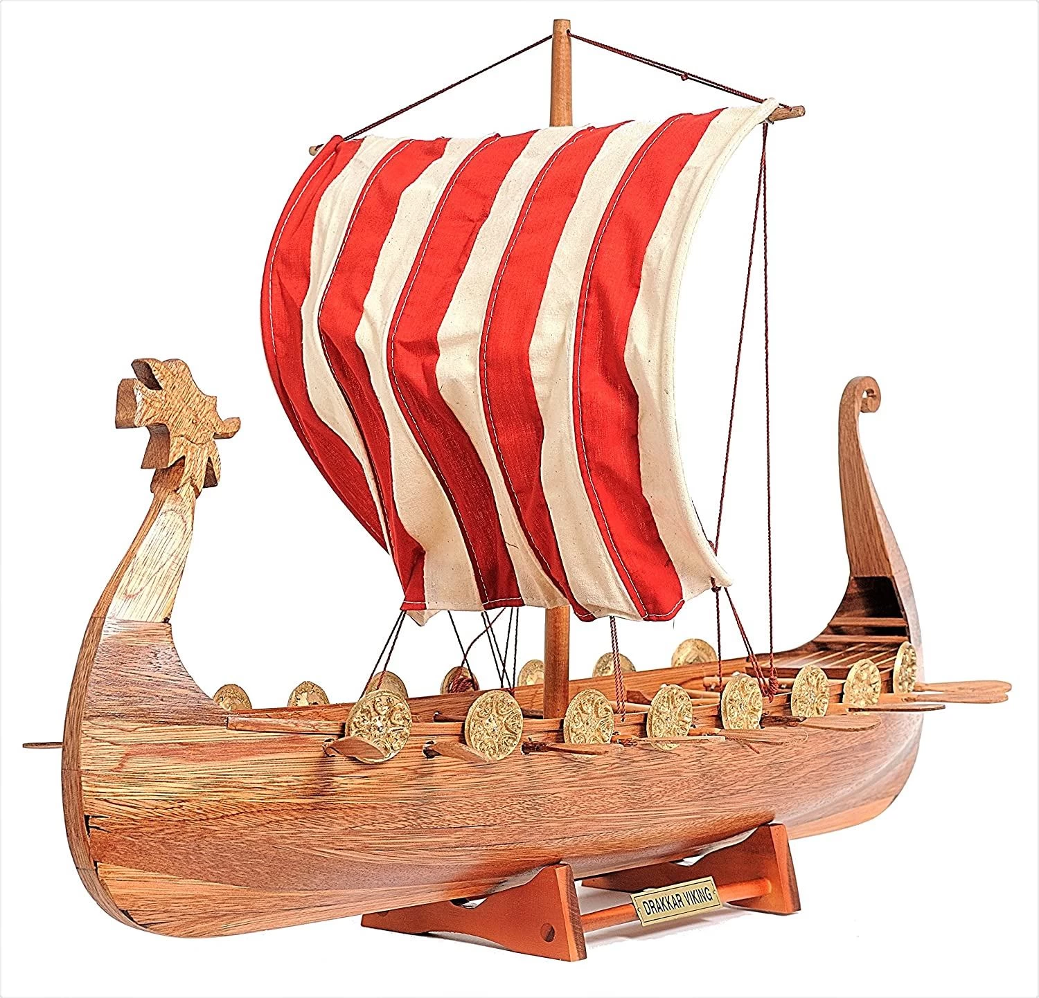This model is simple, but stunning! It is a replica of the Drakkar viking long boat, a classic boat used by the Viking between 7th & 10th century. It looks and feels like a miniature real boat. This 25-inch model is handcrafted with the highest quality woods from scratch by master artisans using “plank on frame” construction, just like real boats. Each model takes more than 50 hours to construct and undergoes a demanding quality-control process. Among the details of this boat model: lines of shields along 2 sides of boats, many wooden oars, colorful viking sail, brass nameplate and stand.
