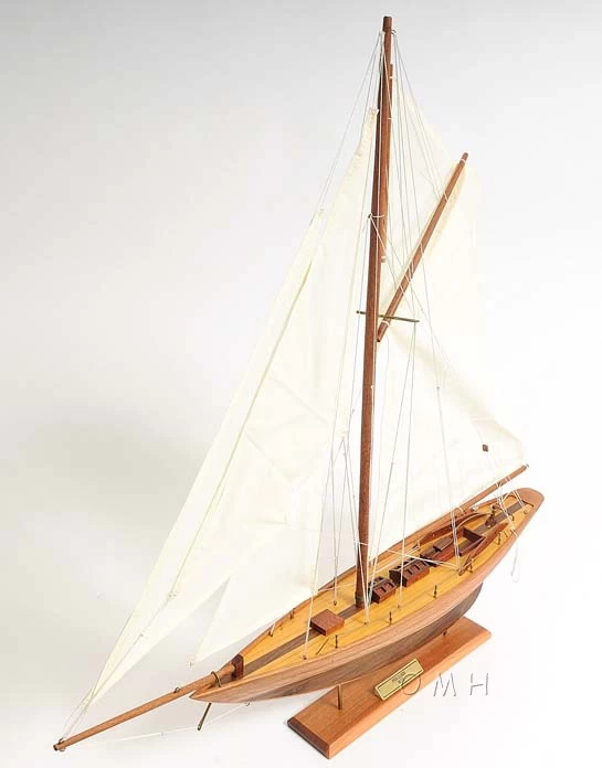 This model hull is handcrafted from strips of wood using plank on frame construction method. The deck is made from many strips of wood. There are various details on the deck such as hatches, winches, and cabin. One can also locate a metal filter on the deck near the companionway. The stitched sail and intricate rigging complete the definition of a true sailing boat.