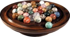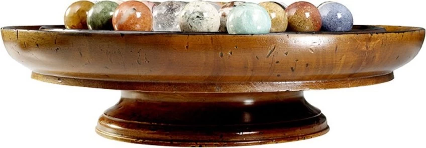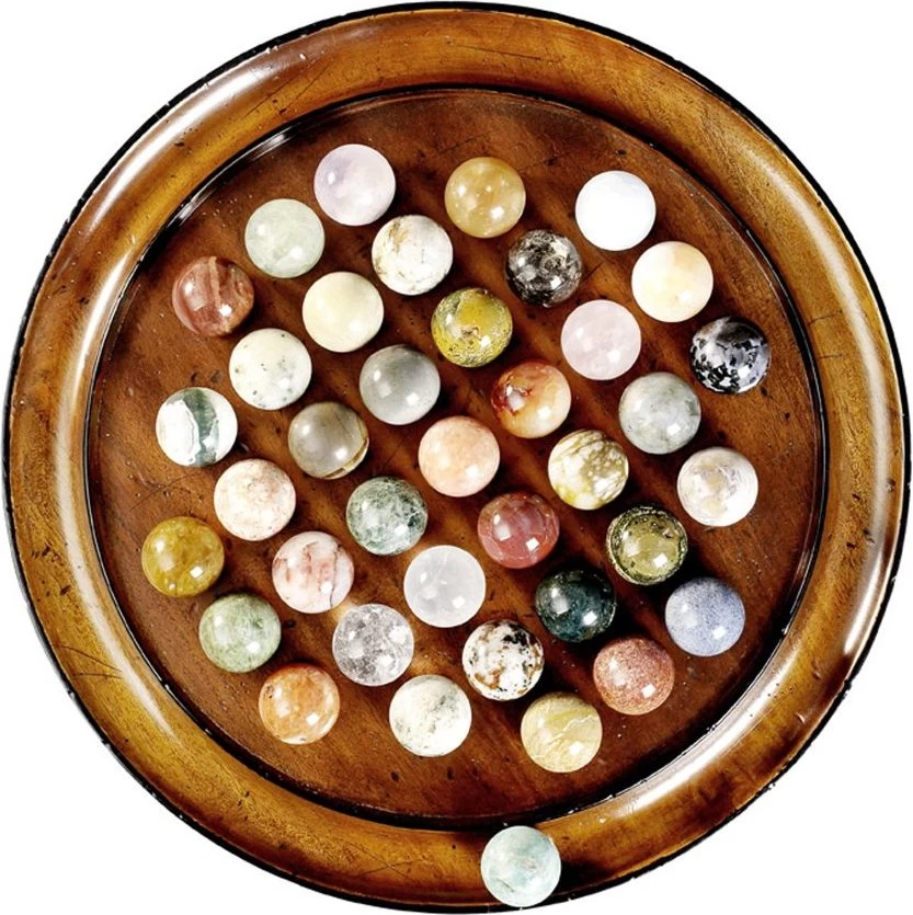 The game of Solitaire is reputed to have been invented by a nobleman confined in the Bastille prison during the early years of the French Revolution. The game is played with 36 marbles. The object is to eliminate all but one marble, which should ideally end up in the center of the game board. French finished game board on a small pedestal. 38 semi-precious stone spheres as playing pieces.